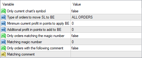 El script de breakeven para MetaTrader admite una serie de parámetros de entrada que le permiten elegir en qué posiciones desea que funcione y cómo desea que se modifique el nivel de equilibrio.